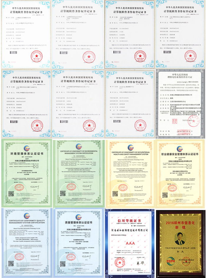 2016.09 云和数据先后通过了AAA信用等级认证、ISO9001质量管理体系认证、ISO14001环境管理体系认证、OHSAS18001职业健康安全管理体系认证、CMMI软件能力成熟度模型集成三级认证以及ICP增值电信业务经营许可证;
