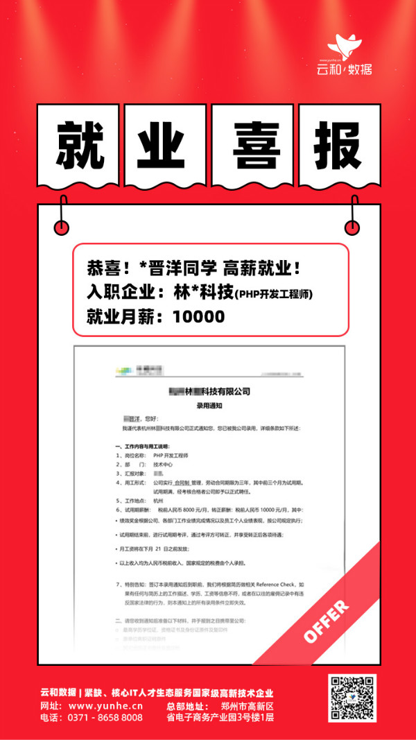 恭喜云和数据晋洋同学高薪就业!月薪1万元!岗位PHP开发工程师!