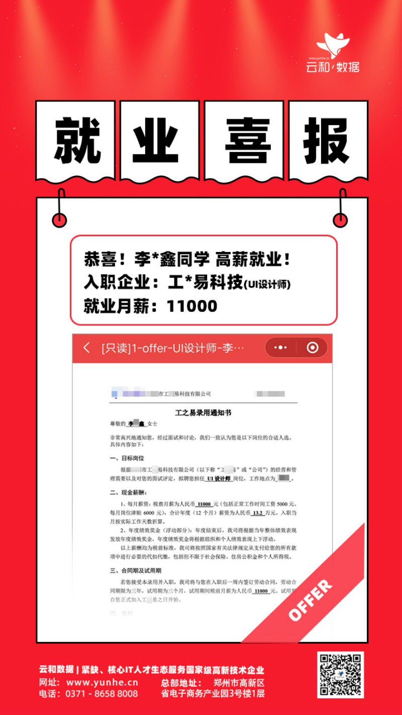 恭喜云和数据李同学高薪就业!月薪11K!岗位UI设计师!