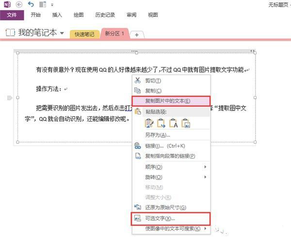 (1)打开OneNote软件,插入需要识别文字的图片,右键选择“复制图片中的文本”或“可选文字”。