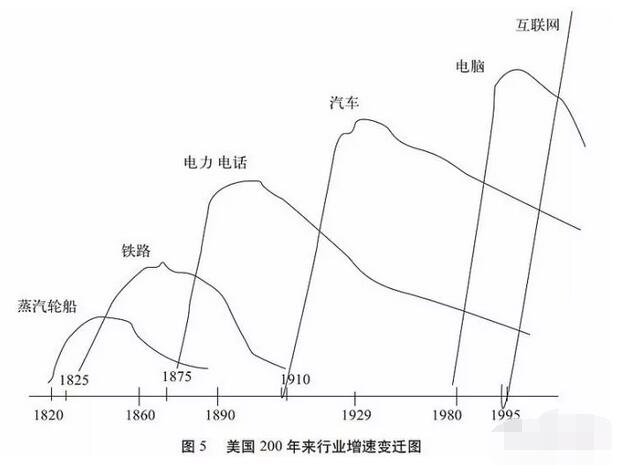 上图,是美国 200 年来行业增速变迁图,描述了从1820年的蒸汽轮船到1995年的互联网在内的,几大行业的变化趋势。国内的行业发展趋势与美国类似,但稍稍滞后几年。每一个行业的增速,均经历了增长、见顶、缓慢下降的阶段。