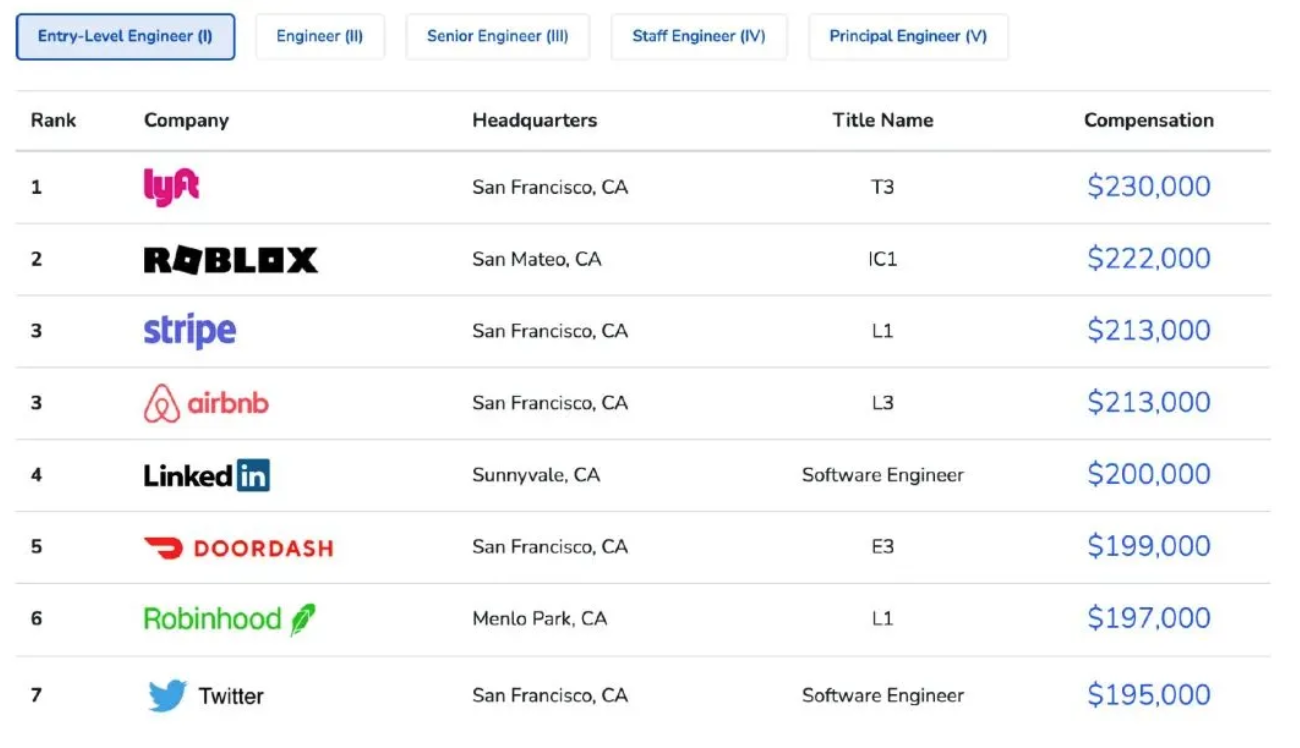 入门初级工程师当中,lyft 公司的中位数工资是:23 万美元。也就是说有一半以上的初级工程师工资是高于 23 万美元的。排名第二,第三的分别是:ROBLOX ,stripe 和 airbnb 。Twitter 排名第七是 19.5 万美元。