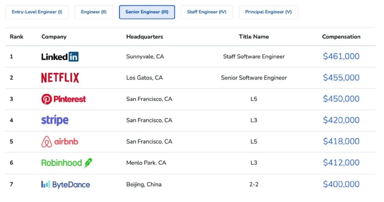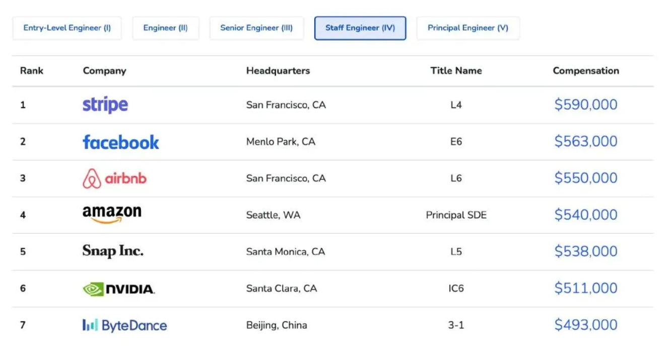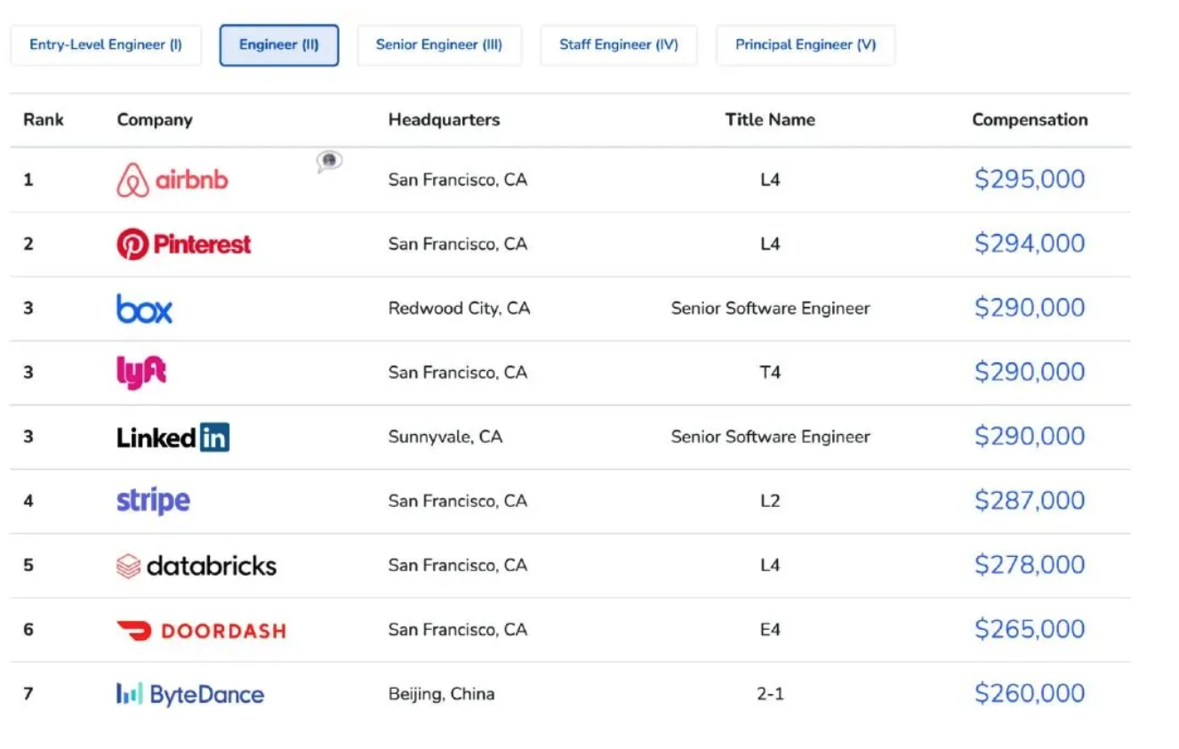 工程师当中,排名第一的是 airbnb ,中位数是 29.5 万美元。排名第七的是字节条跳动,中位数是 26 万美元,是唯一一个中国上榜的互联网公司。
