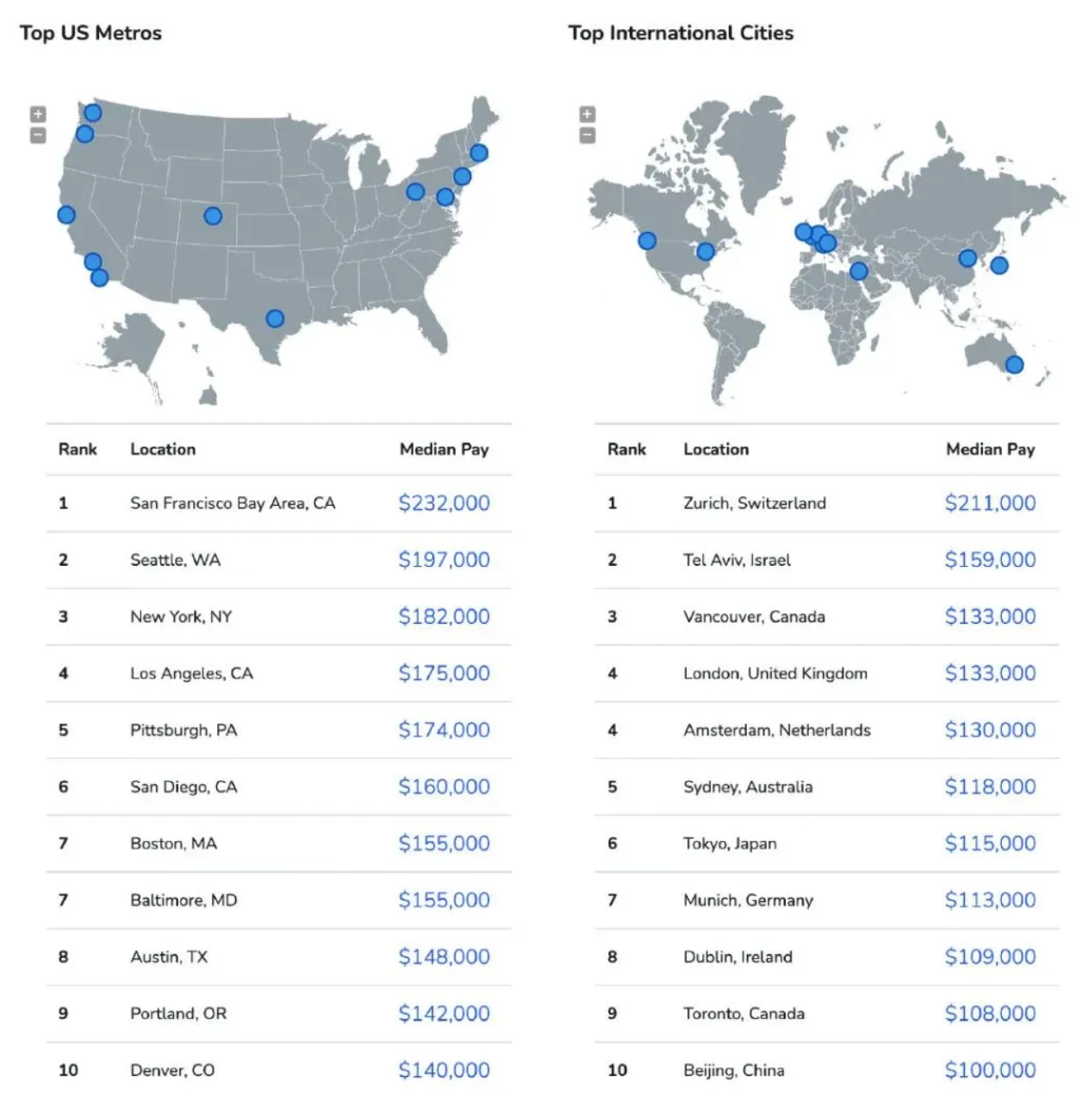 从地域分布上看,北京排名第十,薪资达 10 万美元。