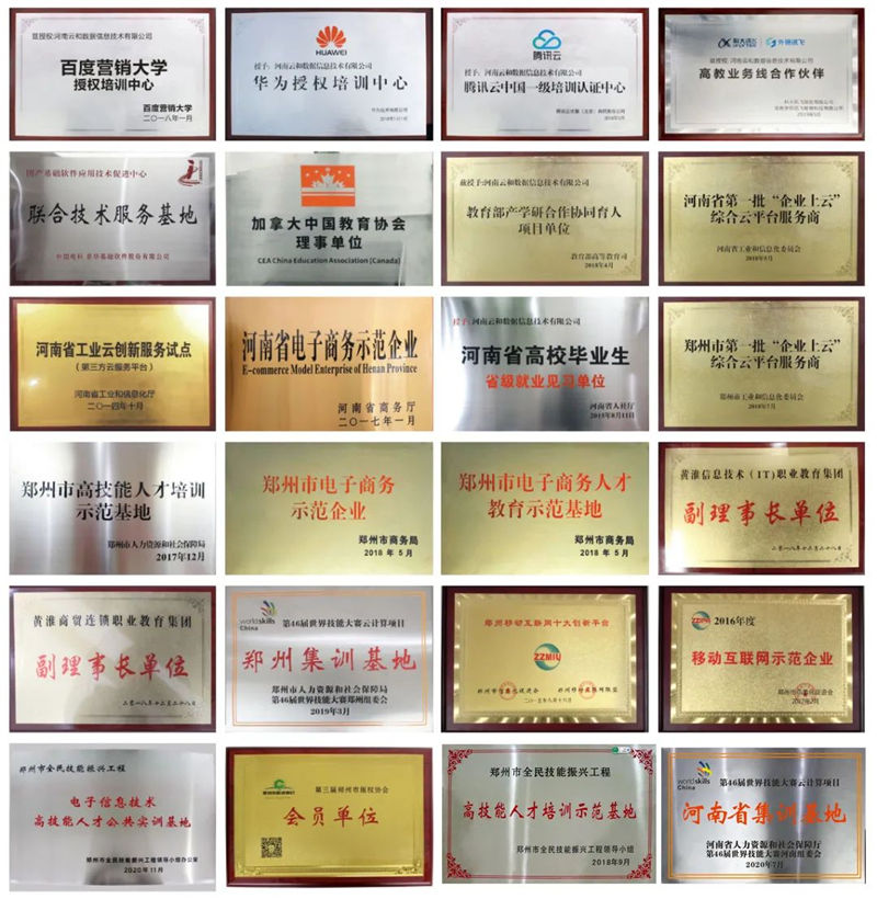 云和数据成立8年来,获得了教育部第一批产学合作协同育人项目单位、河南省电子商务示范企业、河南省第一批产教融合型入库培育企业、郑州市电子信息技术高技能人才公共实训基地、郑州市服务外包人才培训机构、第三届郑州市版权协会会员单位、第46届世界技能大赛(云计算方向)省、市两级集训基地、郑州高技能人才培养示范基地、郑州电子商务人才教育示范基地等数十项殊荣。
