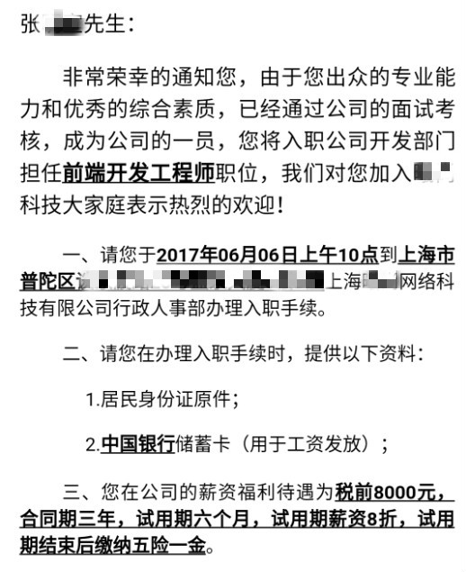 张同学是云和数据HTML5专家班一名普通的学员,现如今,成功入职上海某网络科技有限公司,担任前端开发工程师一职,月薪8000元。